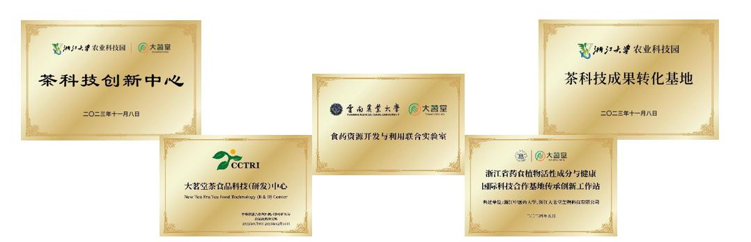 长期以来,公司与国内多所高等院校、科研机构建立并开启技术合作关系,先后与浙江中医药大学共建“浙江省药食植物活性成分与健康国际科技合作基地”传承创新工作站、与中华全国供销合作总社杭州茶叶研究院共建“大茗堂茶食品科技(研发)中心”、与浙江大学农业科技园有限公司共建“茶科技创新中心”“茶科技成果转化基地”、与云南农业大学共建“食药资源开发与和用联公实验室”,充分整合市场资源,为21世纪倡导“茶为国饮”及“为健康饮茶”提供更具深度和内涵的产业支撑。